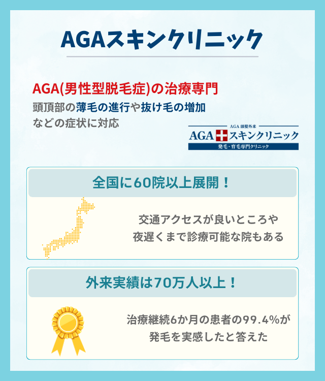 AGAスキンクリニックは、AGA(男性型脱毛症)の治療を行う専門クリニックである。
