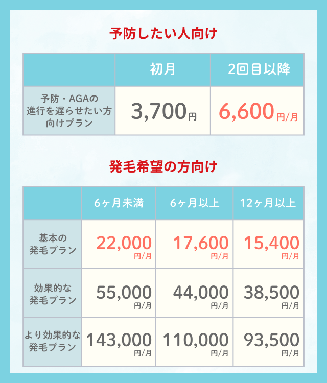| AGA予防プラン | 3,700円 | 6,600円/月 |