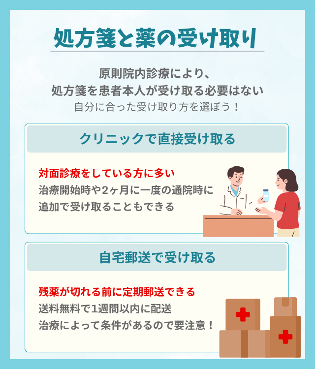 一方で、AGAスキンクリニックは原則として院内処方で対応している。そのため、基本的に患者本人が処方箋を受け取って薬局へ行く必要はない。