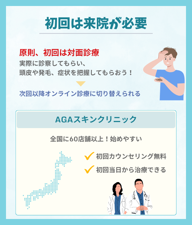 初回にしっかりとカウンセリングを行ってもらえば、以降は同じ内容で問題なくAGA治療が進められるはずなので、オンライン診療に切り替えても差し支えないだろう。オンライン診療を希望している方も、初回は理想の治療が進められるように初回来院の必要性を理解しておこう。