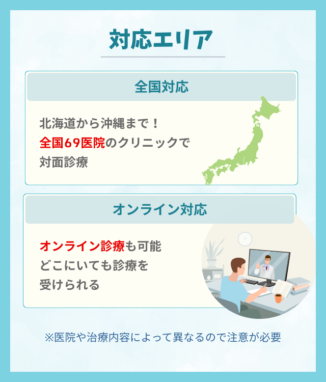 AGAスキンクリニックは北海道から沖縄まで、全国69院で対面診療を行っている。多くの院は駅から近く、アクセス面の利便性が高い。提携駐車場が用意されているため、車で通院したい場合にも利用しやすい。
