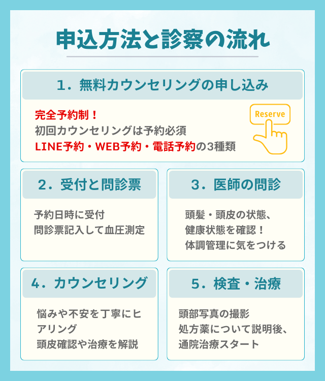ここでは、AGAスキンクリニックの申し込み方法と、その後の診察の流れを順番に解説する。流れは次のとおりである。