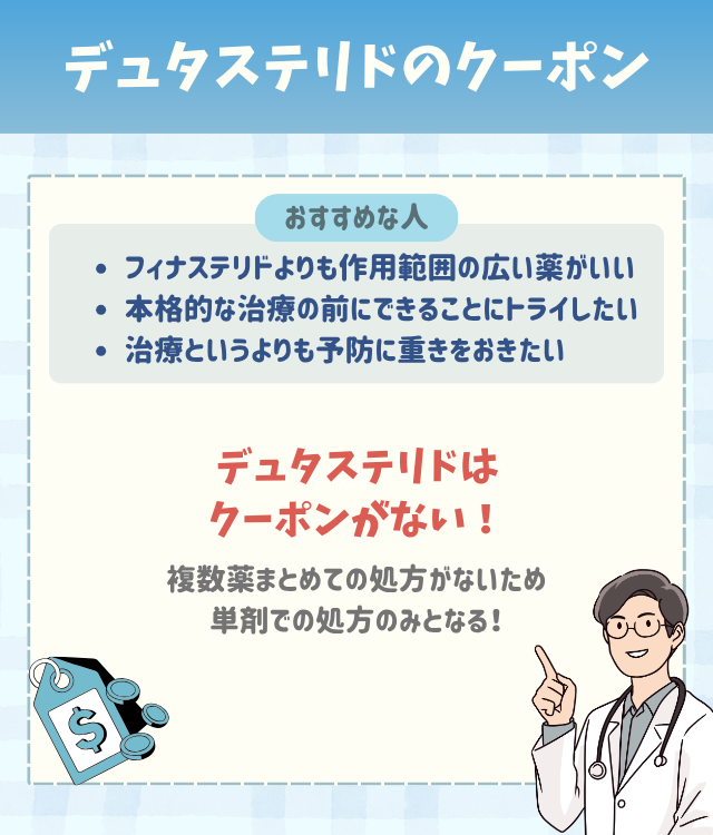 デュタステリドを含む複数薬のパッケージプランは設けられていないため、希望する場合は単剤処方で相談する必要がある。クーポンは適用できないため、費用を抑えて予防を優先するなら、まずフィナステリドで様子を見るのも一つの考え方だろう。