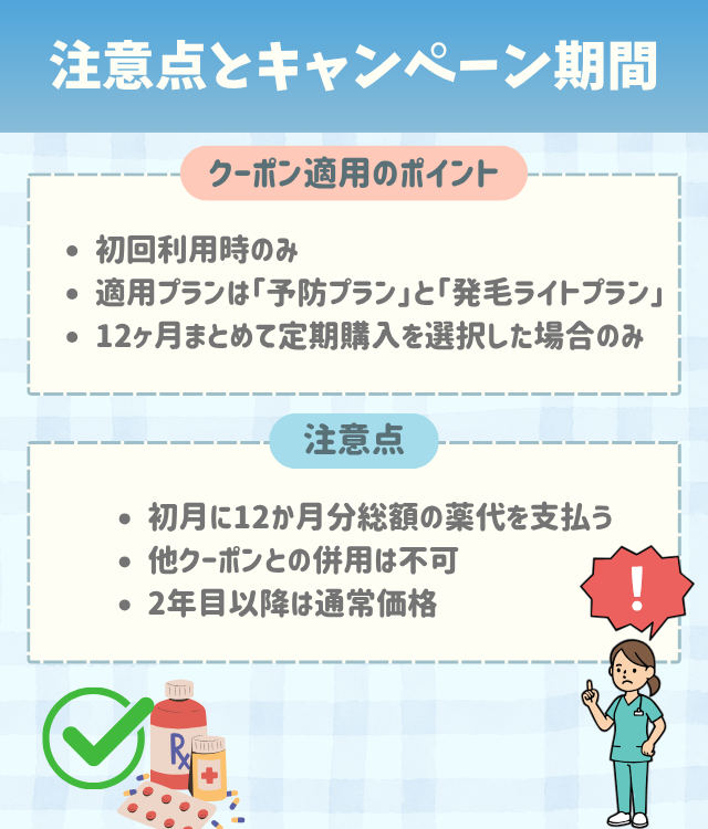 クーポンを利用すると「12ヶ月分のおまとめ購入+定期便」という条件になり、「薬代6か月分無料+700円引き」が適用される。費用負担を抑えつつ治療を始めたい人には、検討しやすい選択肢だろう。
