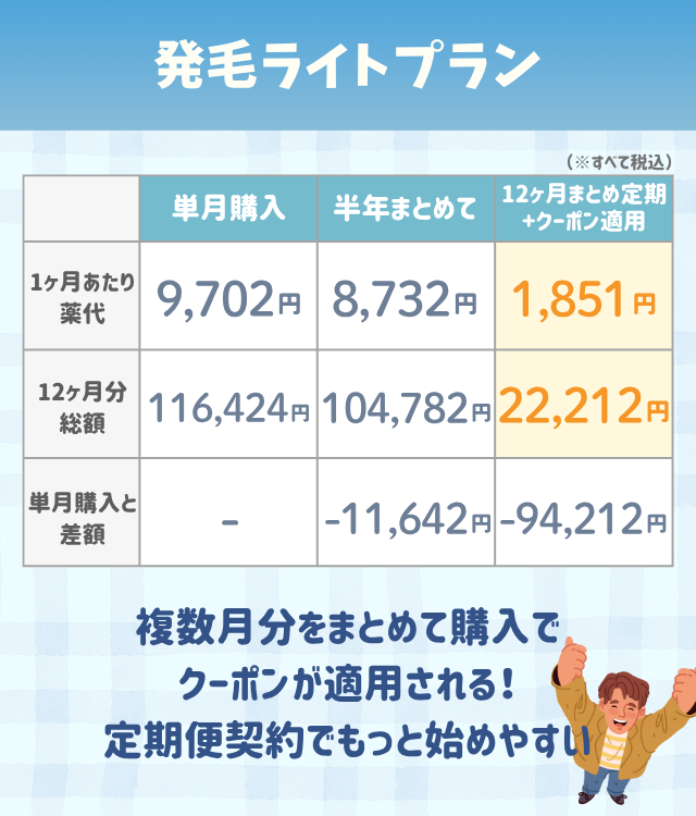 発毛ライトプランも、クーポン適用で「12ヶ月分のおまとめ購入+定期便」となり、さら「薬代6か月分無料+9,950円引き」が反映される。