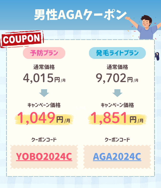 | 男性AGA 予防プラン ▼ AGAクーポンコードを受け取る | 4,015円/月(税込) | 1,049円/月(税込) | YOBO2024C |