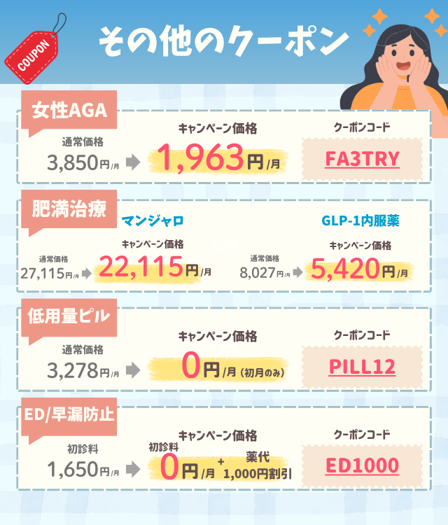 はじめに、代表的な診療メニューの通常料金とキャンペーン適用後の料金、そして利用できるクーポンコードを確認しておくとよいだろう。