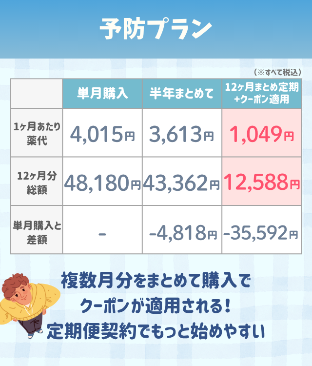 - 【適用条件】予防プランの12ヶ月まとめて定期契約をした場合の薬代が「6か月分無料+700円引き」になります。別途配送料550円が発生します。処方されなかった場合は、診察料1,650円が発生します。決済ページのクーポン欄に必ず「YOBO2024C」とご入力ください。