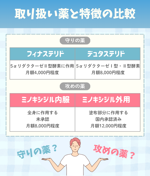 クリニックフォアでは、内服薬と外用薬あわせて5種類の薬を取り扱っている。