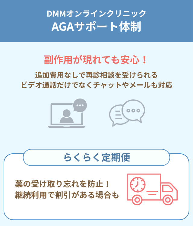 DMMオンラインクリニックでは、治療中のサポート体制も充実している。診察後に副作用などの症状が現れた場合でも、追加費用なしで医師による再診相談を受けることが可能である。再診はビデオ通話だけでなく、チャットやメールといった方法でも対応しており、利用者の都合に合わせた柔軟なサポートが提供されている。