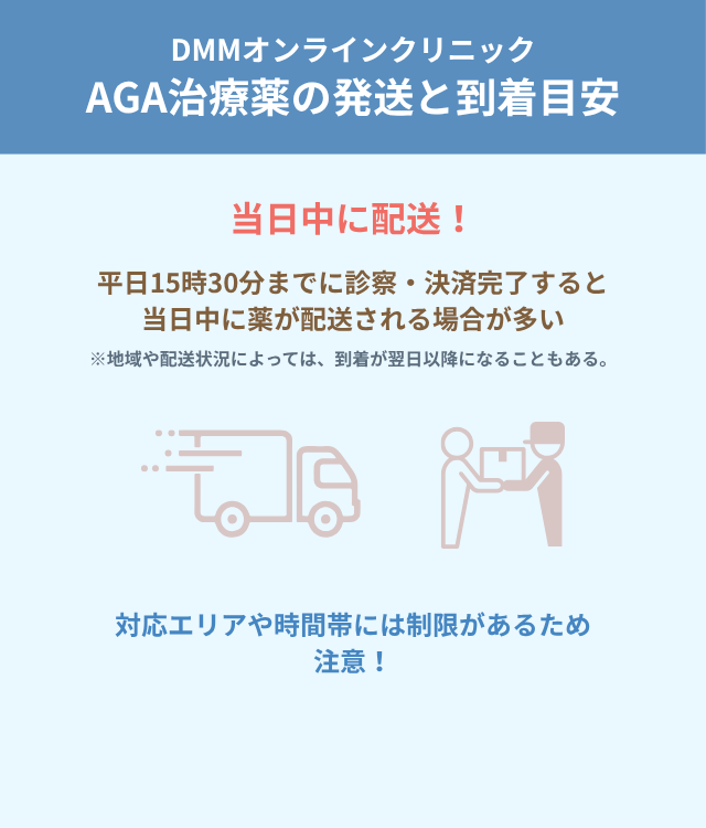 DMMオンラインクリニックでは、平日15時30分まで(土日祝は14時30分まで)に診察および決済が完了した場合、当日中に薬が発送される可能性が高い。