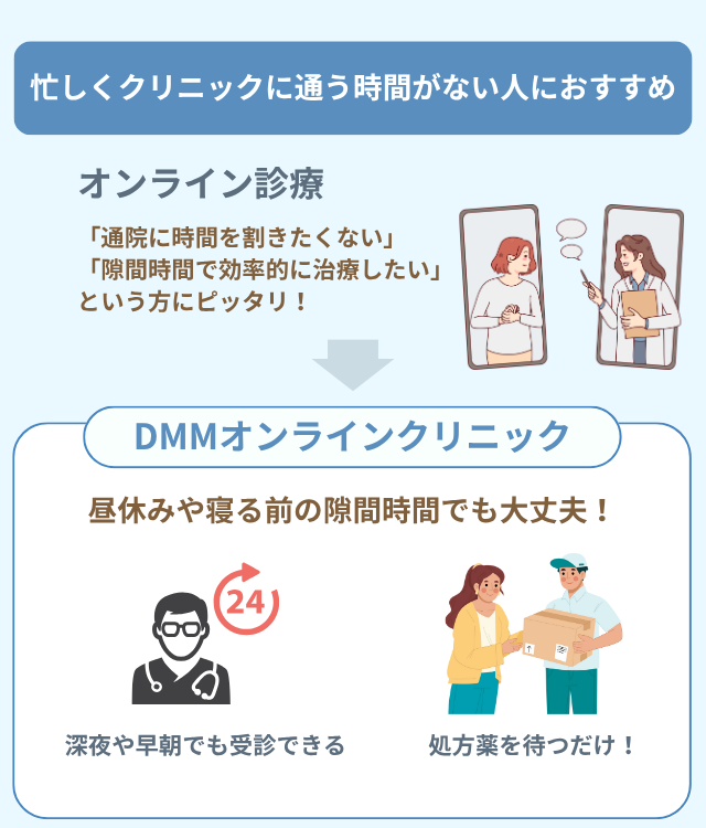 - 医師の判断により対面診療が必要な場合があります。医師の判断によりお薬を処方できないことがあります。※診療件数は2022年4月〜2025年5月の期間におけるオンライン診療プラットフォーム「DMMオンラインクリニック」を利用したオンライン診療の実績(全診療科目のお薬の発送実績及び診療件数を含む)です。
