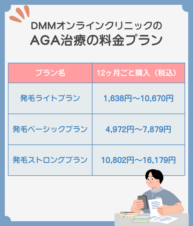 DMMオンラインクリニックでは、気になる薄毛治療を手頃な価格で始められる料金プランが用意されている。