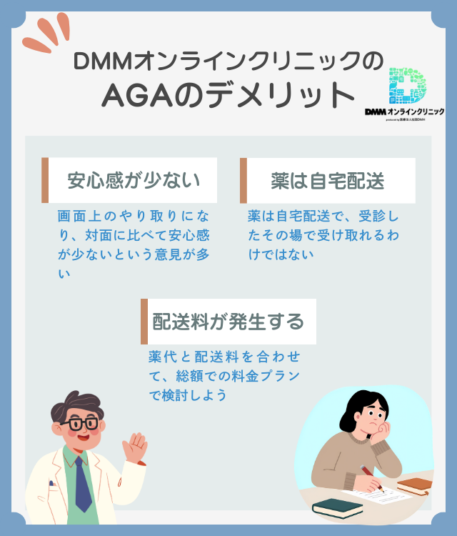 DMMオンラインクリニックのAGA治療は利便性が評価されている一方で、オンライン診療ならではの気になる点もある。実際の利用者回答では「特にデメリットは感じなかった」が4割を占める一方、少数派の意見としていくつか共通点が見えている。
