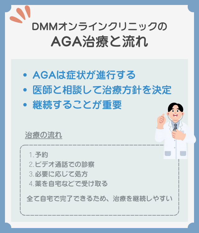 DMMオンラインクリニックでは、オンライン診療によってAGA治療の診察を受けられる。AGA(男性型脱毛症)は進行する特徴があるため、状態に合わせて医師と相談しながら治療方針を決め、継続していくことが重要になりやすい。