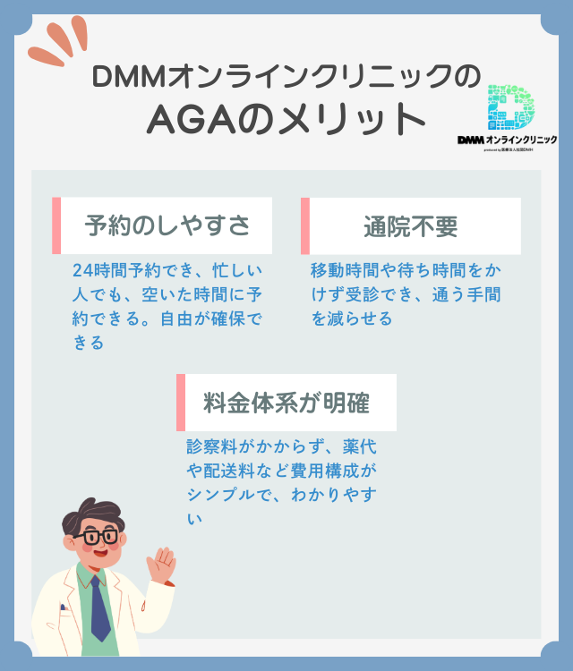 DMMオンラインクリニックのAGA治療は、オンライン診療を軸に「通院の手間を減らして治療を継続しやすくする」設計が中心である。