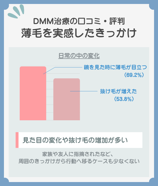 アンケートでは「鏡を見たときに薄毛が目立つようになった(69.2%)」が最も多く、次いで「抜け毛が増えた(53.8%)」が続いた。つまり、見た目の変化や抜け毛の増加といった“いつもの違和感”が受診の後押しになっている構図だ。