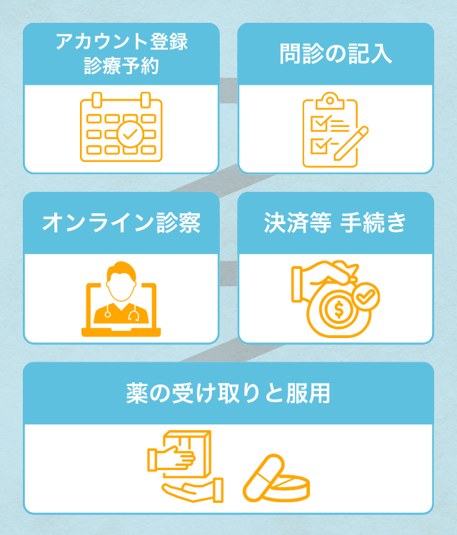 DMMオンラインクリニックでAGAオンライン診療を受ける流れは、以下の5ステップで構成されている。