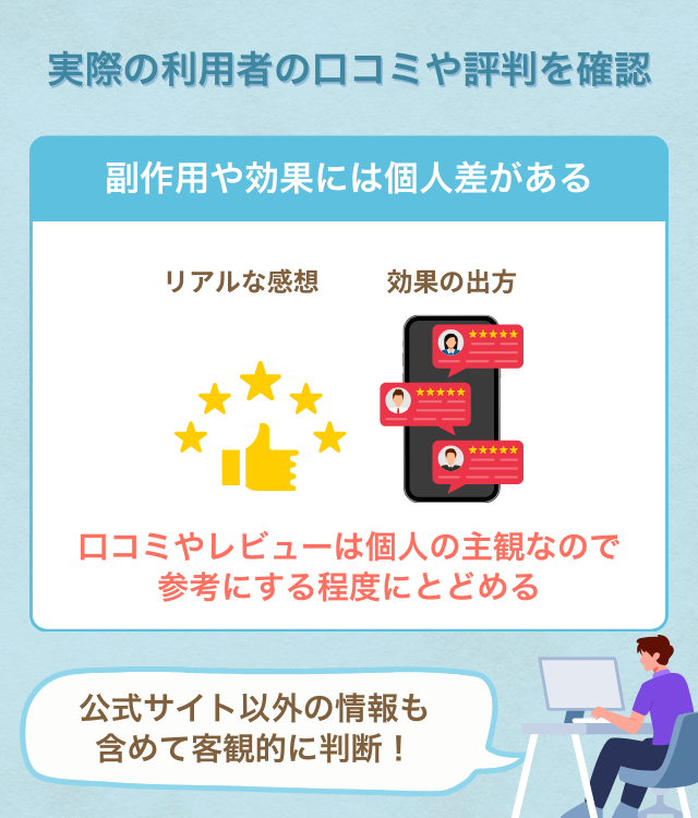 具体的には、SNSやブログ・レビューサイトなどをチェックすると、効率的に情報が集まるだろう。この時注意したいのは、口コミは個人の主観であり人によって副作用や効果の出方には違いがあるという点だ。同じ薬を飲んだとしても全く同じ効果が得られるわけではないので、あくまでも判断材料の1つとして参考にする程度にとどめてほしい。