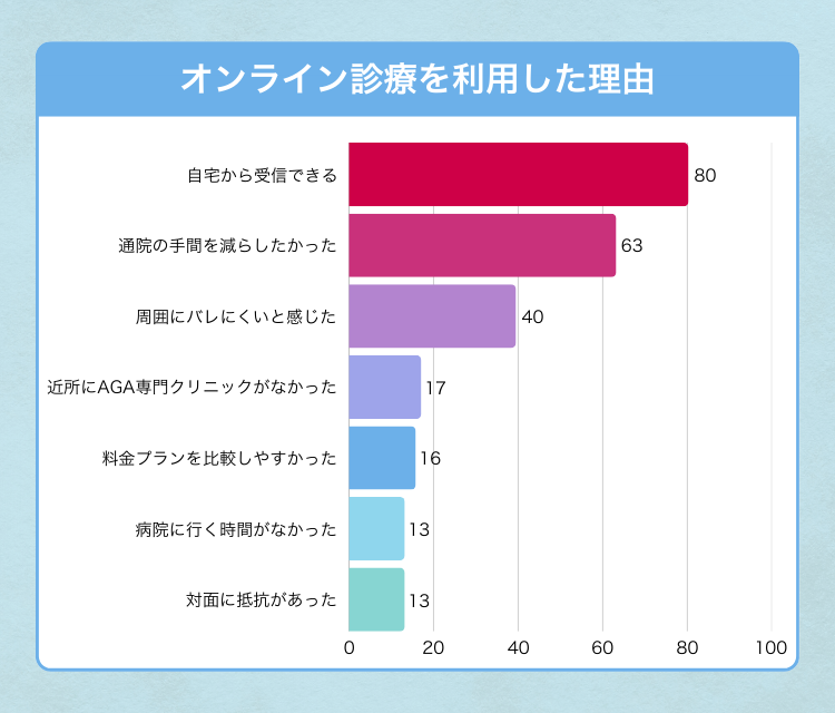 オンラインを選ぶ理由で突出して多いのは「自宅で受診できる(80.3%)」で、次いで「通院にかかる時間や手間を減らしたい(63.2%)」が続く。「周囲に知られにくい(39.5%)」も一定数あり、利便性だけでなく心理的な負担の少なさが背中を押していると考えられる。
