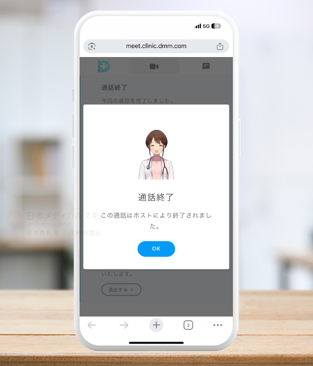 診療が終了すると、医師が退出し、代わりにオペレーターから連絡が入る。診療料金や支払い方法・薬の受け取り場所等の案内や次回以降の受診の流れについての説明が行われる。