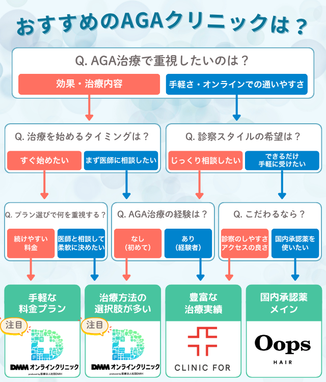 AGAのオンライン診療のおすすめクリニックは、月1,638円(税込のAGA発毛プランがある「DMMオンラインクリニック」、豊富な治療実績がある「クリニックフォア」、国内承認薬を中心に扱う「Oops HAIR」である。