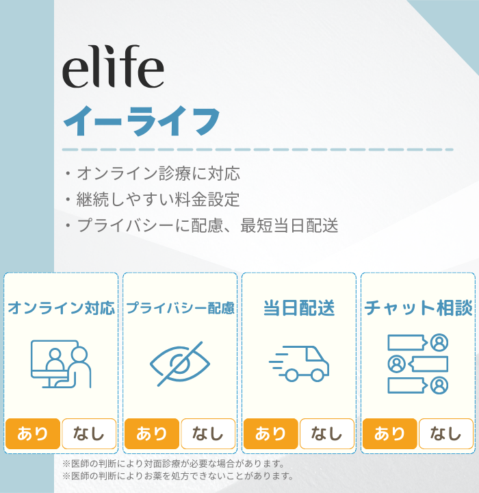 ![]() elife | 5,500円 | なし | なし | 国産ジェネリック医薬品を用いたシンプルな治療プラン |