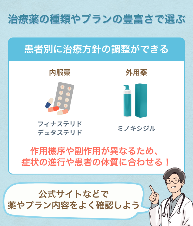 そのため、取り扱う治療薬の種類やプランの多さは、クリニック選びの重要なポイントとなるのだ。取り扱う薬の種類が多いクリニックでは、その分、患者個別の状態に応じて治療方針の調整ができるという利点がある。