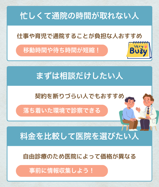 スマホやパソコンを使い、自宅やプライベートな空間で診察が受けられるのは、忙しい人にとって魅力的なサービスだろう。通院のための移動時間や院内での待ち時間がないことも、時間を効率良く使いたいと考える人に支持されている。また、時間や手間といった負担感から治療がなかなか継続できないという人にも向いているだろう。