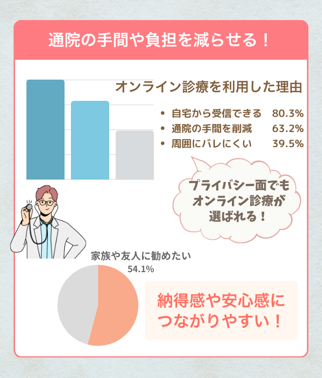 実際の調査でも、オンライン診療を利用した理由としては、「自宅から受診できるから」が80.3%で最も多く、次いで「通院の時間・手間を減らしたかったから」が63.2%と続いており、利便性を重視する人が多いことが分かる。さらに「周囲にバレにくいと感じたから」も39.5%となっており、プライバシー面もオンライン診療が選ばれる理由の1つだと言える。
