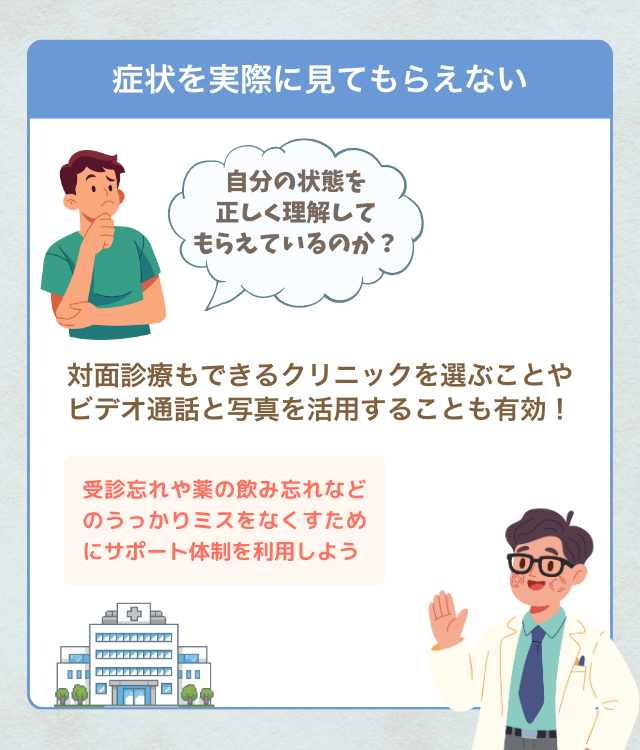 この点については、オンライン診療の中でも対面を組み合わせて受診できるクリニックを選んだり、ビデオ通話だけでなく写真を活用することが有効である。