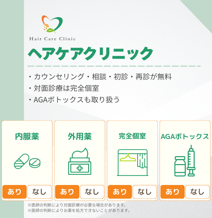 ![]() クリニック フォア | 8,140円 | なし | 12,760円 | 国内承認薬の治療プランが多い |