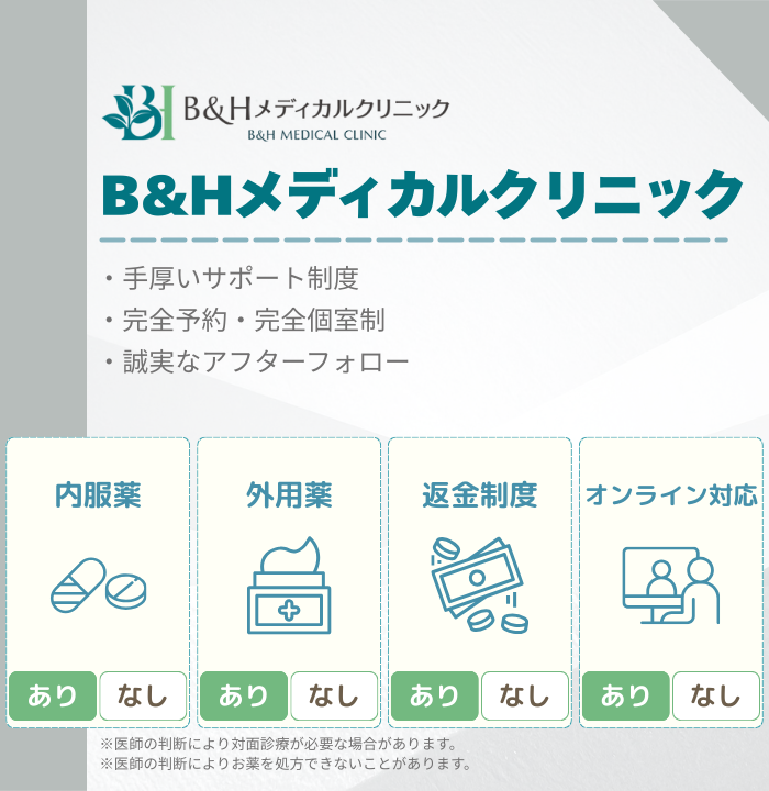 ![]() B&H メディカル クリニック | あり (返金保証) | ①返金保証制度の申込(申込書あり) ②初回来院時に12ヶ月コース+施術6回以上契約 ③初回処方から6ヶ月継続 ④治療費総額を現金一括 ⑤医師が発毛なしと判断 ⑥制度利用後は治療継続しない | 全額返金 (医師判断) | 現金一括が前提/申込書が必要/詳細条件はスタッフ確認必須(条件を満たさないと対象外) |