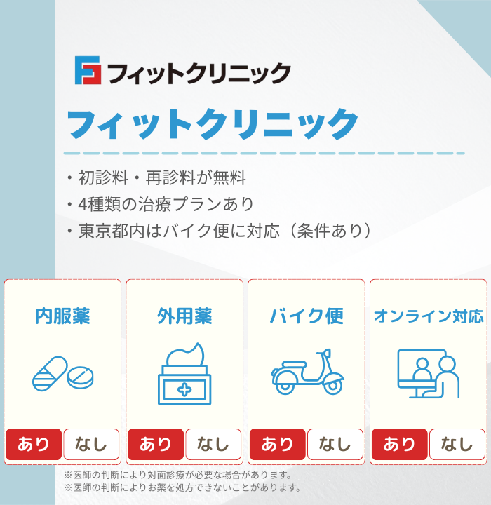 ![]() フィット クリニック | 平日・土 10:00〜20:00 日祝 10:00〜18:00 | 15時までにご入金の確認 |