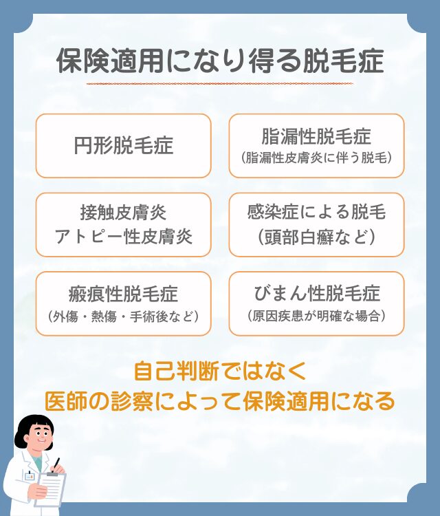 貧血、甲状腺疾患、薬剤性など、原因となる疾病が特定されている場合は、その基礎疾患の治療として保険診療が行われる可能性がある。