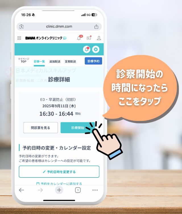予約した診察日の時間が来たら、マイページより当該日時の「診療開始」をセレクトし、医師の入室を待つ。この際、別タブや別のアプリは開かないよう注意してほしい。