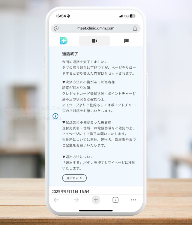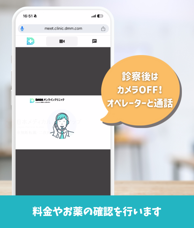 診察終了後は顔出し不要でオペレーターとの通話になる。オペレーターから薬代、支払い方法、配送などの説明があり、支払いが確定する。