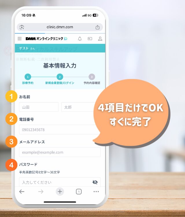 日時の選択後、基本情報を入力する。名前、電話番号、メールアドレスといった基本情報を入力する。