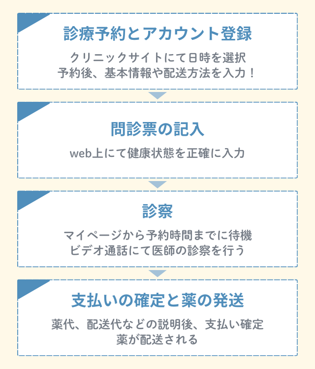 クリニックで扱われるED薬の価格や、薬剤の組み合わせなどが理解いただけたところで、診察の予約から薬の発送までのステップを解説する。