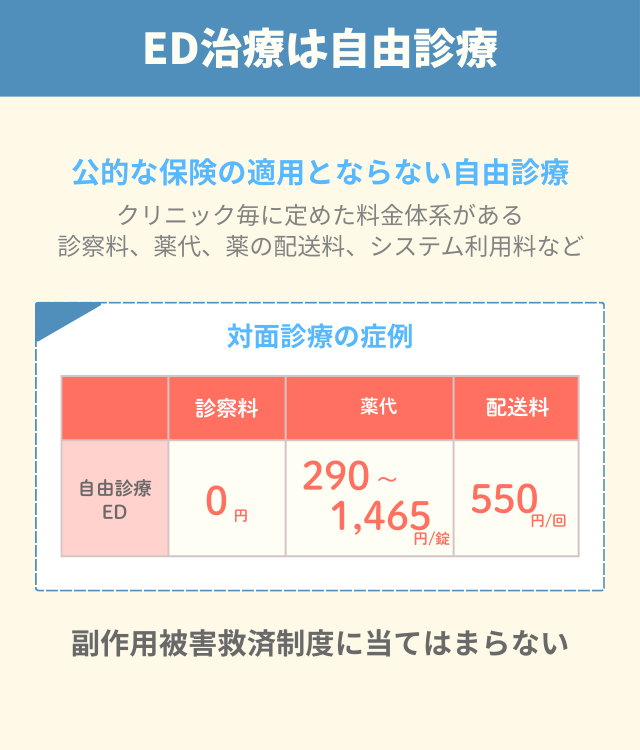 ED治療は、一般に公的医療保険の対象外となる自由診療である。ただし、費用は各クリニックが定める料金体系によって決まる。内訳としては、診察料、薬代、薬の配送料、システム利用料などが含まれるケースが多い。