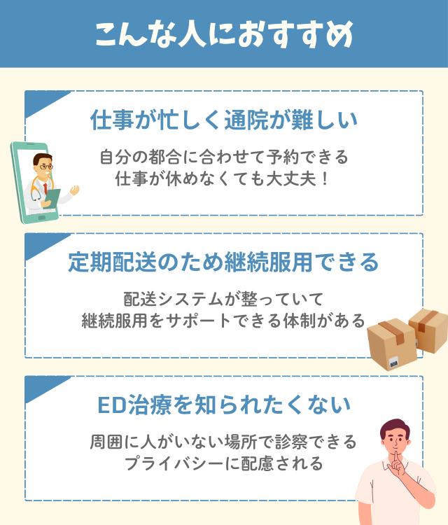 ここでは、ED診療でオンラインを利用する場合の特徴を説明する。