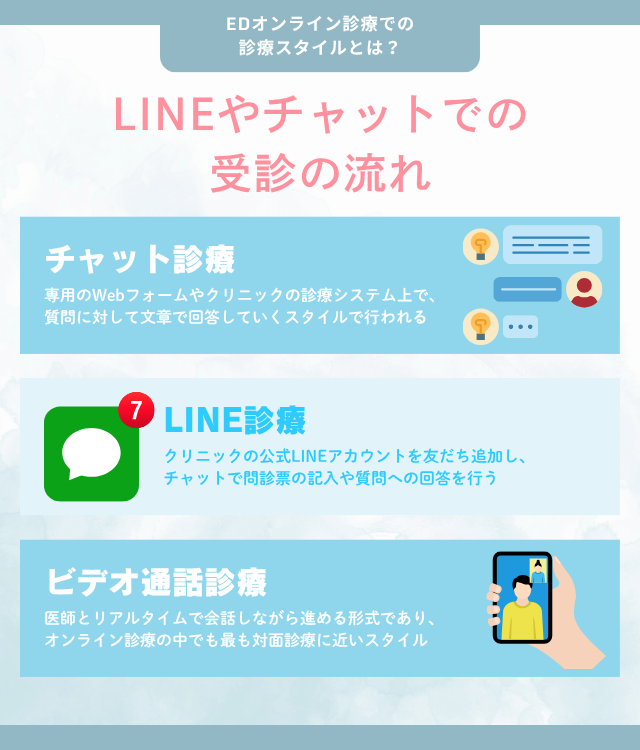 オンラインED診療には、いくつかのスタイルがある。代表的なのはチャット、LINE、ビデオ通話の3つである。