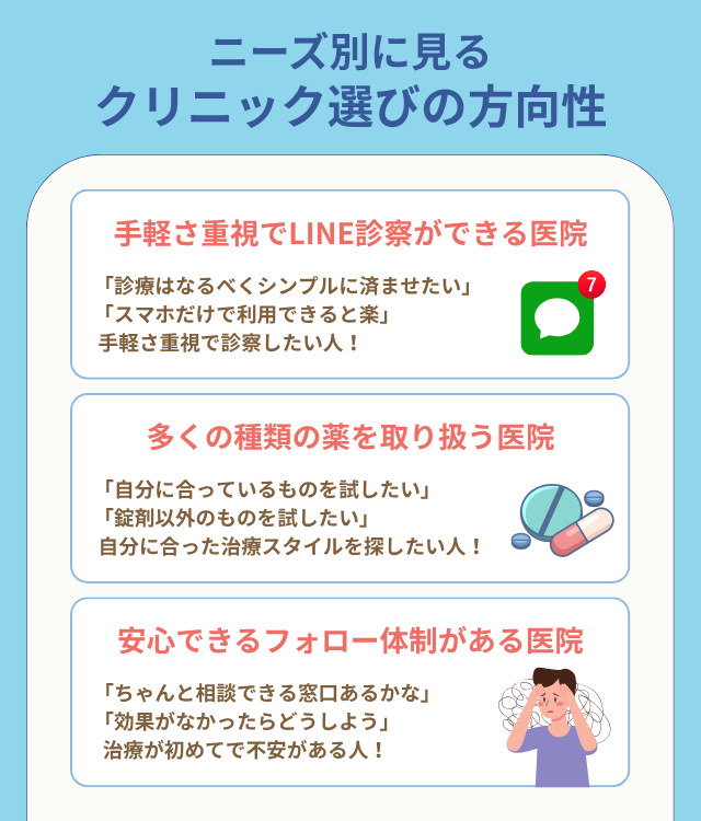 そのため、できるだけ多くの種類の薬を取り扱っているクリニックを選べば、自分に合った処方を見つけやすくなる。