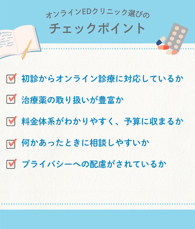 ED治療をオンラインで受ける際は、手軽さや通院不要といった利点がある一方で、対面診療と異なる注意点もある。
