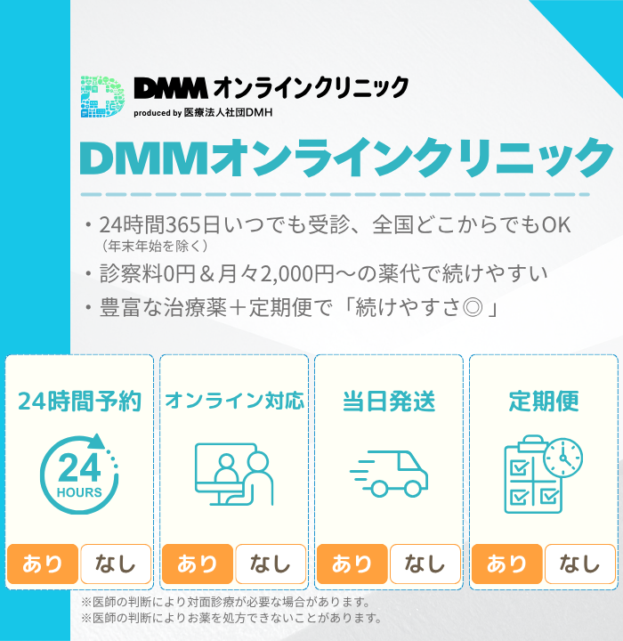 DMMオンラインクリニックは、全国から診療を受けられるオンライン診療サービスだ。初診・再診の診察料は不要で、配送料は全国一律550円。診療時間に空きがあれば比較的早く案内され、対象エリアであれば最短即日発送となる場合もある。