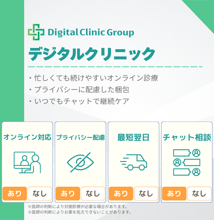 デジタルクリニックグループは、スマートフォンやPCから診察を受け、薬の受け取りまで完了できるオンライン診療サービスを提供している。自宅から気軽に相談できる点が特徴だ。