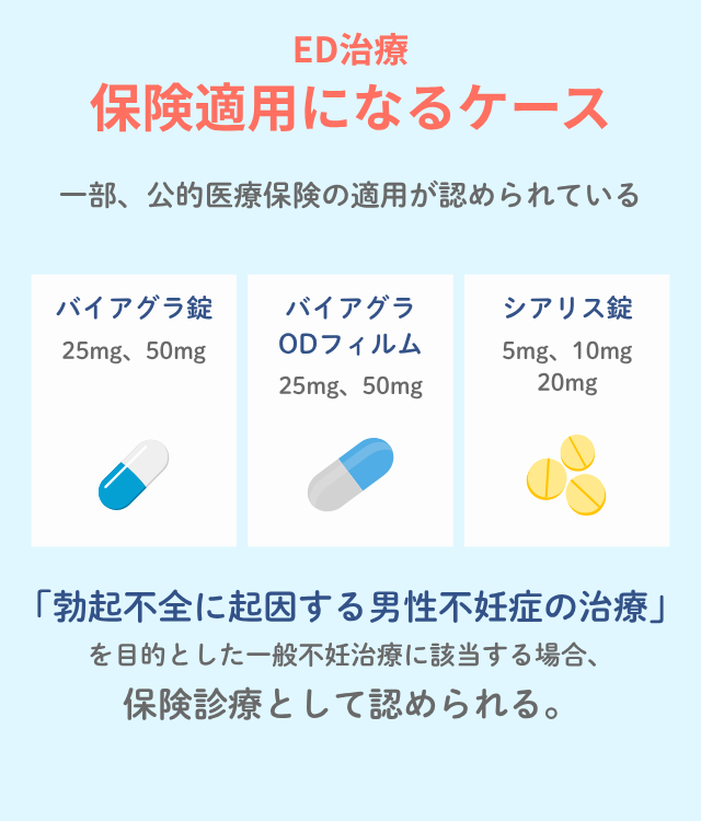 具体的には、バイアグラ錠(25mg・50mg)、バイアグラODフィルム(25mg・50mg)、シアリス錠(5mg・10mg・20mg)の使用が、「勃起不全に起因する男性不妊症の治療」を目的とした一般不妊治療(タイミング法)に該当する場合、保険診療として認められる。