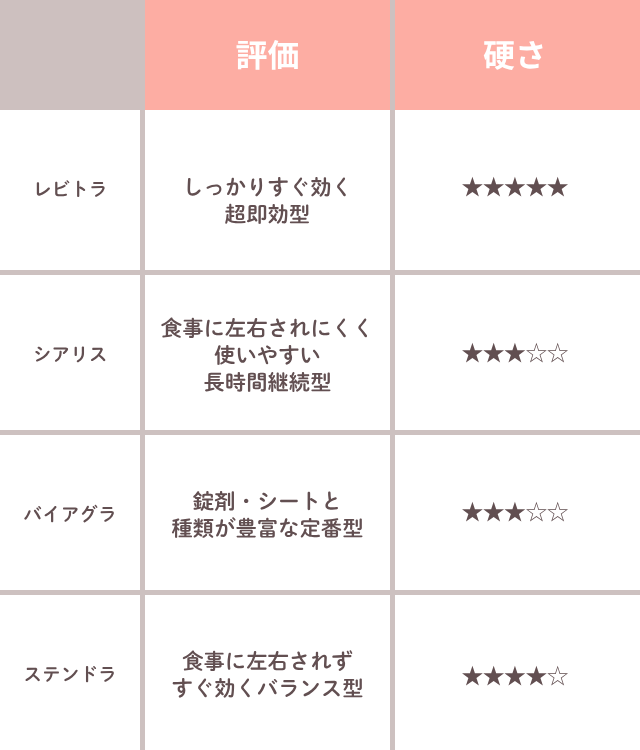 | 勃起 強度 | ◯ 強い | ◎ 最も強い | △ マイルド |