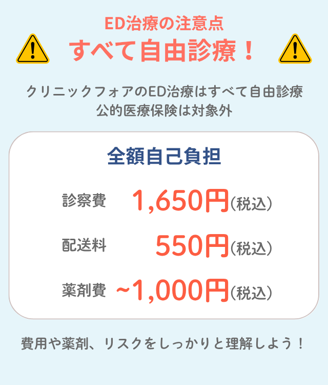 クリニックフォアでのED治療はすべて自由診療であり、公的医療保険の適用対象ではない。ただし、不妊治療目的でED治療を行う場合に限り保険が適用されるケースがある。