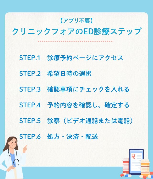【アプリ不要・来院不要】クリニックフォアのED診療ステップ